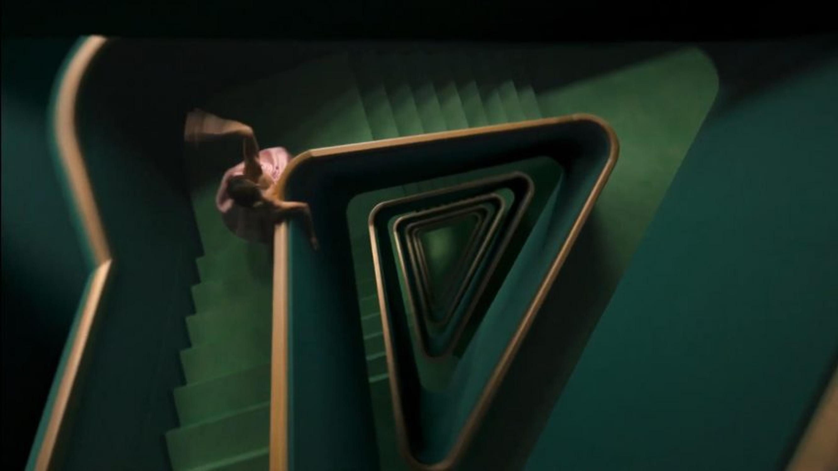 Le flacon Paradigme illustre cette exploration dans son design-même : la pointe du logo Prada (triangulaire) invite à plonger en profondeur, dans les eaux troubles de l’identité. Une plongée incarnée dans un plan d’Emma Watson - dans le film du parfum Paradoxe -, qui dévale un escalier tapissé de vert reprenant la forme du logo et mimant une mise en abîme par la révélation successive de ses strates et de l’obscurité dans laquelle elle s’enfonce.