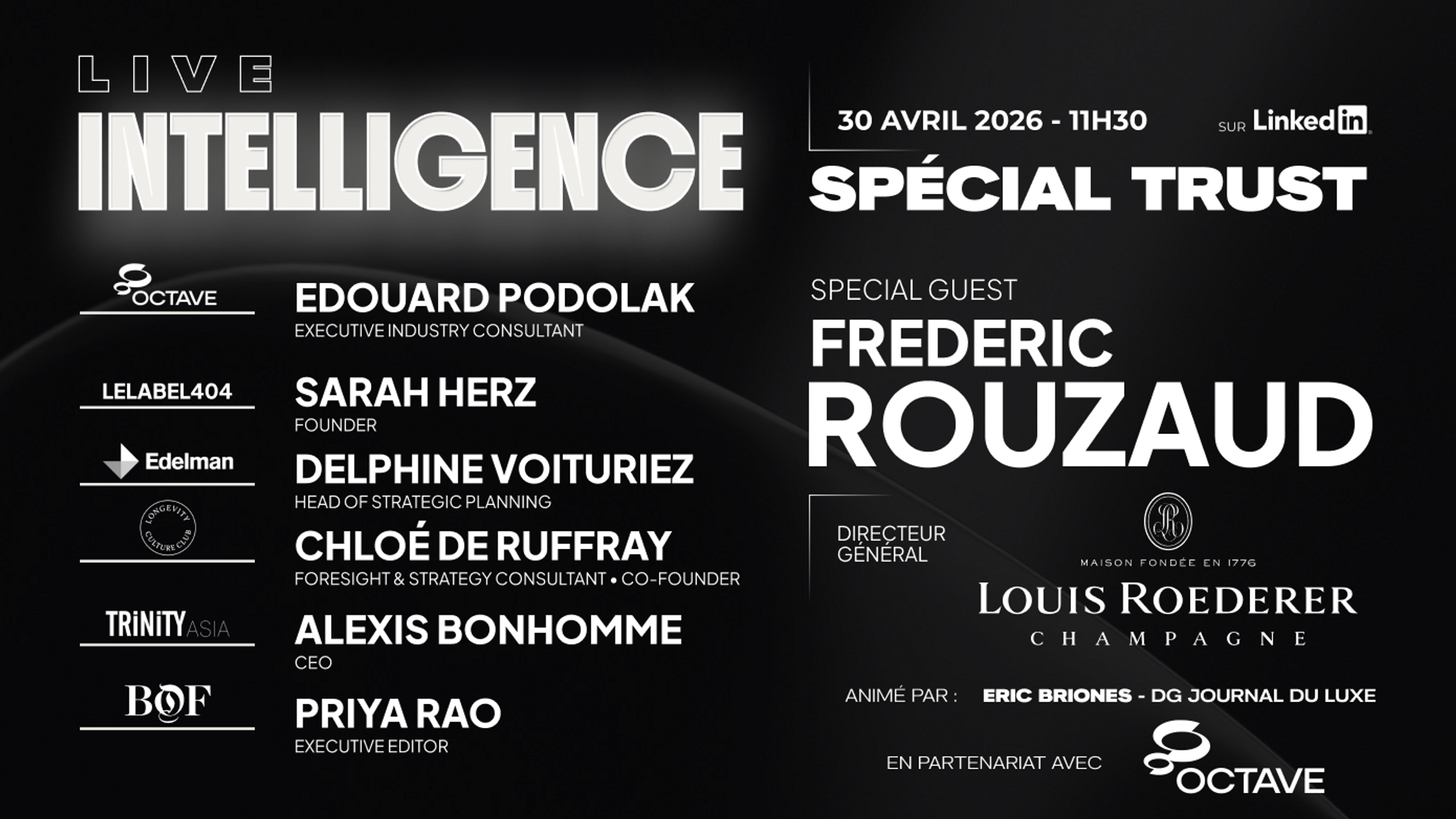 Chaque mois, le Journal du Luxe décrypte en live l’actualité du secteur aux côtés d’experts. Pour ce nouveau numéro, le Journal du Luxe, en partenariat avec Octave, donne rendez-vous à la communauté du luxe pour un nouvel épisode des Live Intelligence, le 30 avril à 11h30 sur LinkedIn.