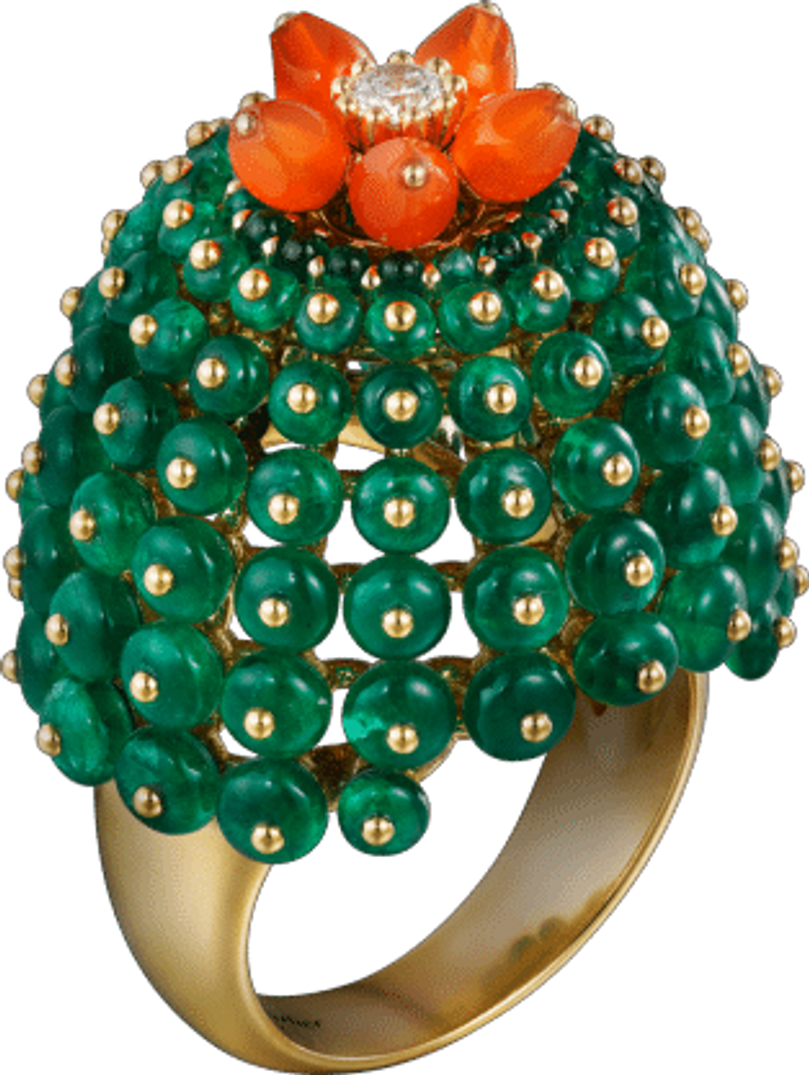 Parmi la nouvelle collection Cactus de Cartier, on retrouve une bague en or jaune 18 carats, munie d’émeraudes de cornalines et sertie d’un diamant taille brillant de 0.10 carat. Un diamant qui fait office de fleur de cactus.