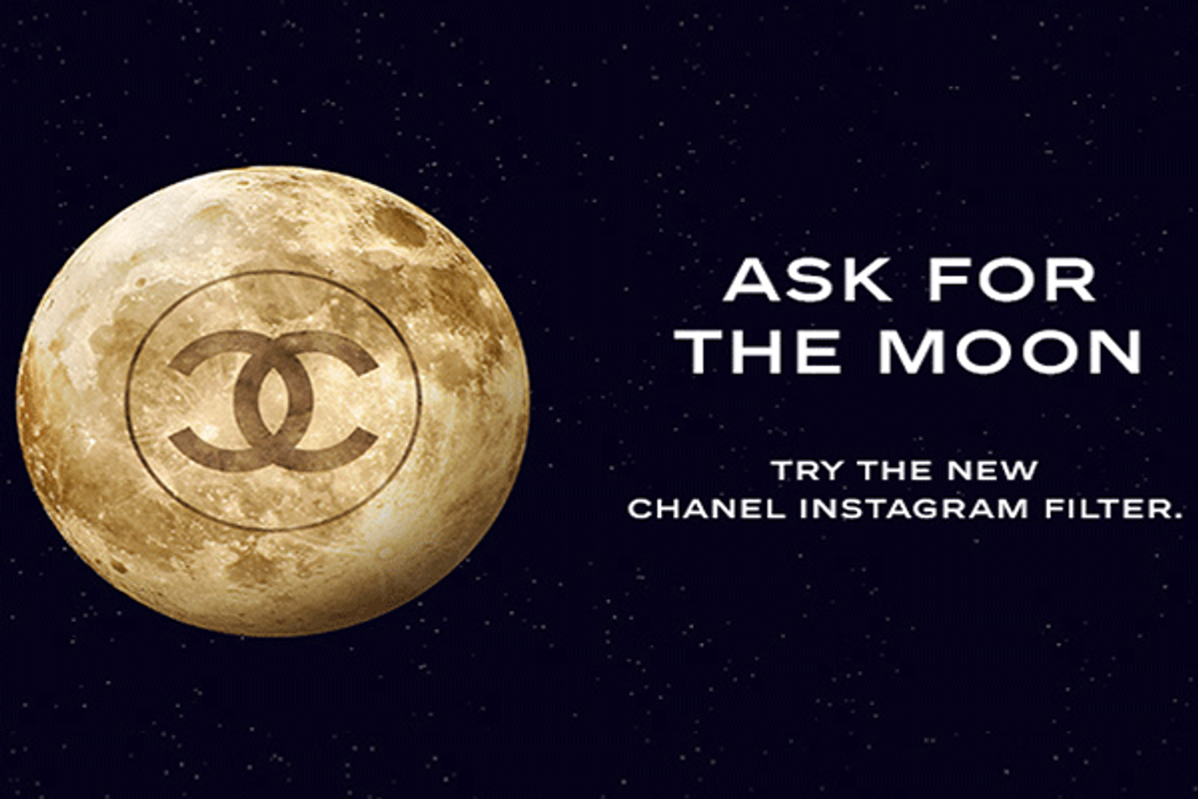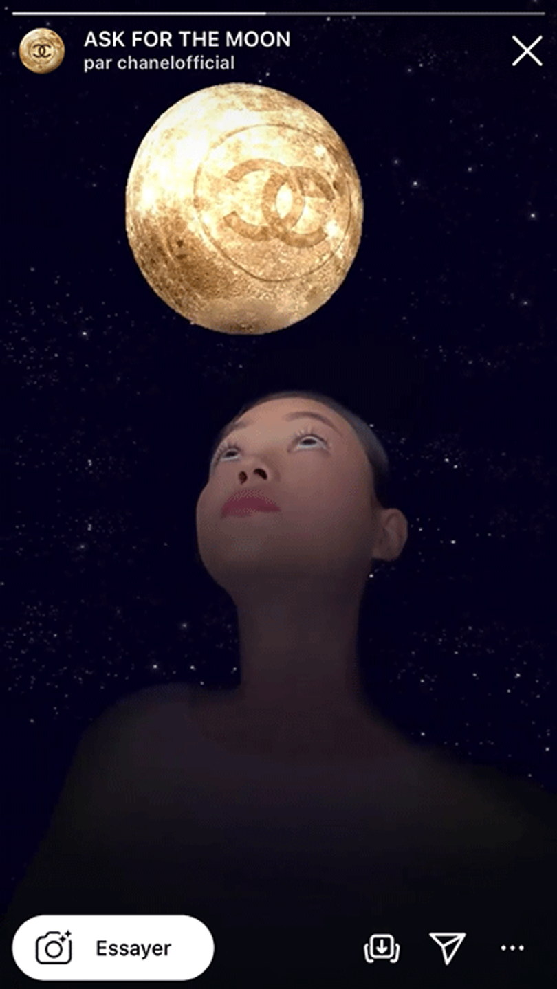 Voûte céleste, lune XXL parsemée d’or, scénographie chorégraphiée… C’est cet univers cosmique que la marque au double C a choisi de décliner dans un nouveau filtre déployé sur son compte officiel Instagram. Baptisée « Ask for the Moon »/ »Demandez la Lune », cette initiative en réalité augmentée met en scène une lune logotée gravitant autour de l’utilisateur, lui-même paré d’un filtre beauté.
