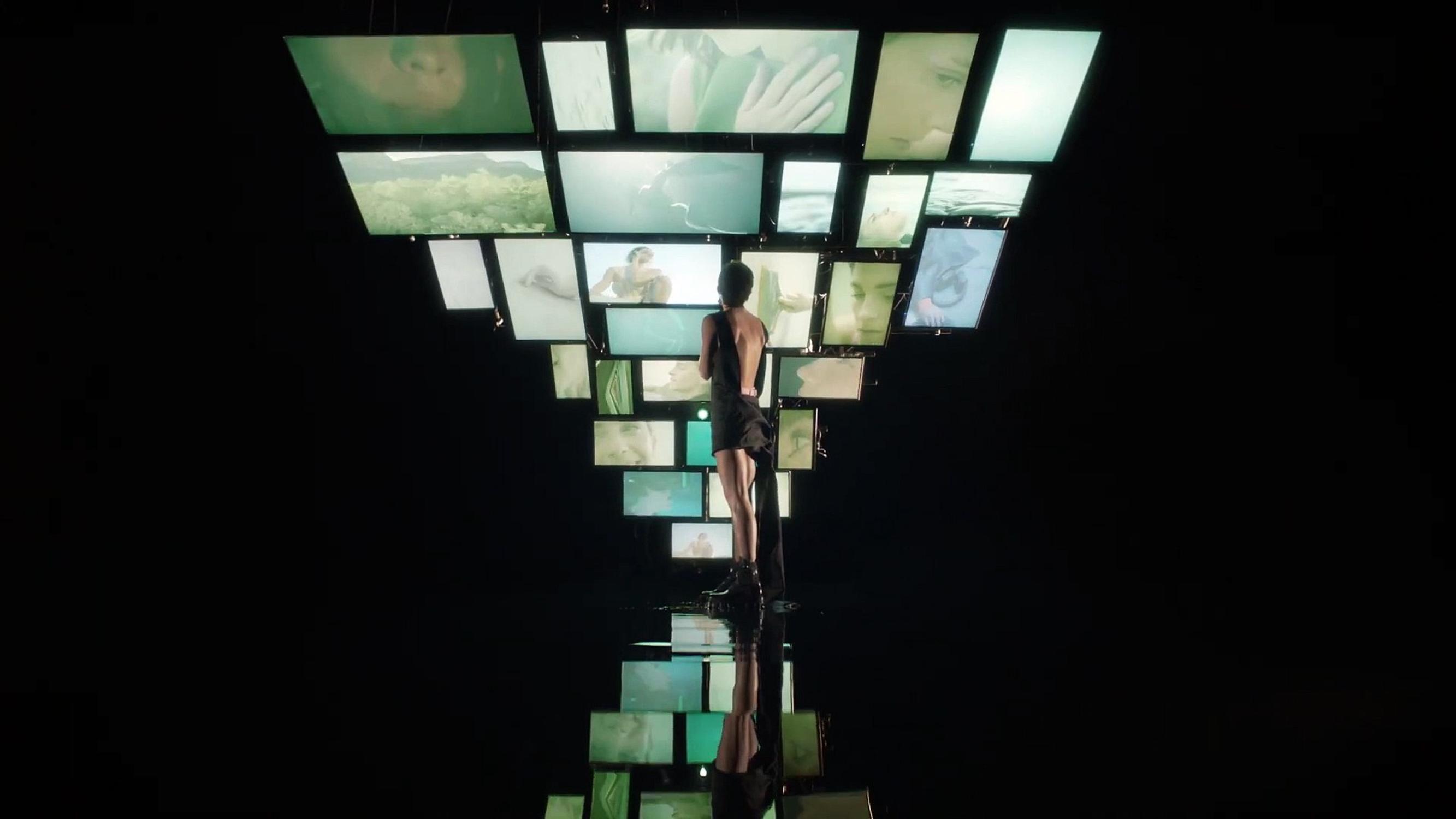 Why should I be framed ?’. Une introspection également du côté de Watson. Elle aussi est dos à nous. Elle aussi a un miroir mais symbolisé par une flaque d’eau qui reflète ses différentes facettes, celles qui apparaissent sur une multitude d’écrans, qui diffusent des images d’elle. C’est comme si elle aussi regardait à travers une fenêtre.