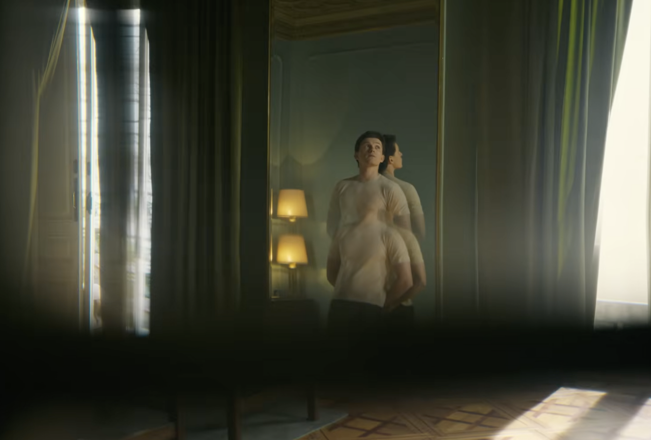 Pour Tom Holland, le film s’ouvre sur l’ouverture d’un rideau : une vue sur le monde et les possibles. Renforcée par un miroir, celui qui offre un nouvel angle de vue. Un miroir pour le renversement des repères. Par proxy du miroir, on incarne le dédoublement, un changement de Paradigme qui s’opère. Holland est dos au miroir car il se cherche.