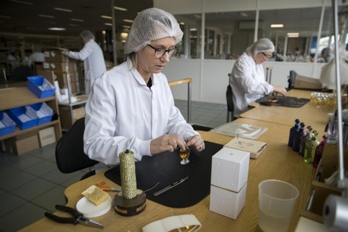 Dans un coin de l’usine où flottent de suaves effluves, les six ouvrières en blouse blanche remplissent délicatement leurs précieuses bouteilles avant de les pomponner, sourdes au bourdonnement des lignes de production automatisées où les classiques de la maison sont embouteillés puis empaquetés à la chaîne.