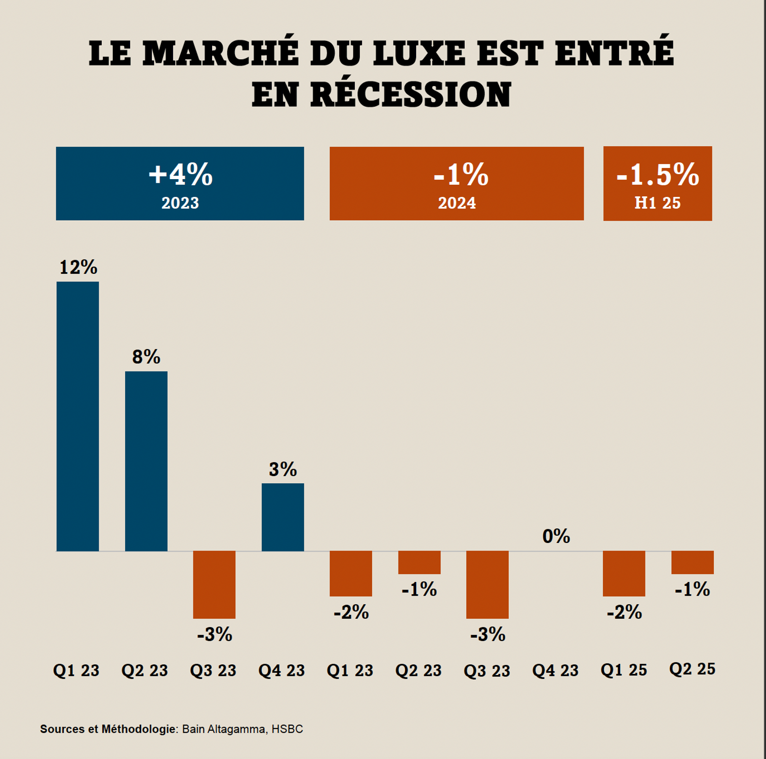 Le marché du luxe traverse indéniablement une phase de ralentissement. En 2024, le secteur est officiellement entré en récession avec une contraction de 1 %. Cette tendance s’est prolongée au premier semestre 2025, avec un recul estimé à 1,5 %, selon les données conjointes de Bain et HSBC. L’ensemble de l’année 2025 devrait ainsi se solder par une performance négative.