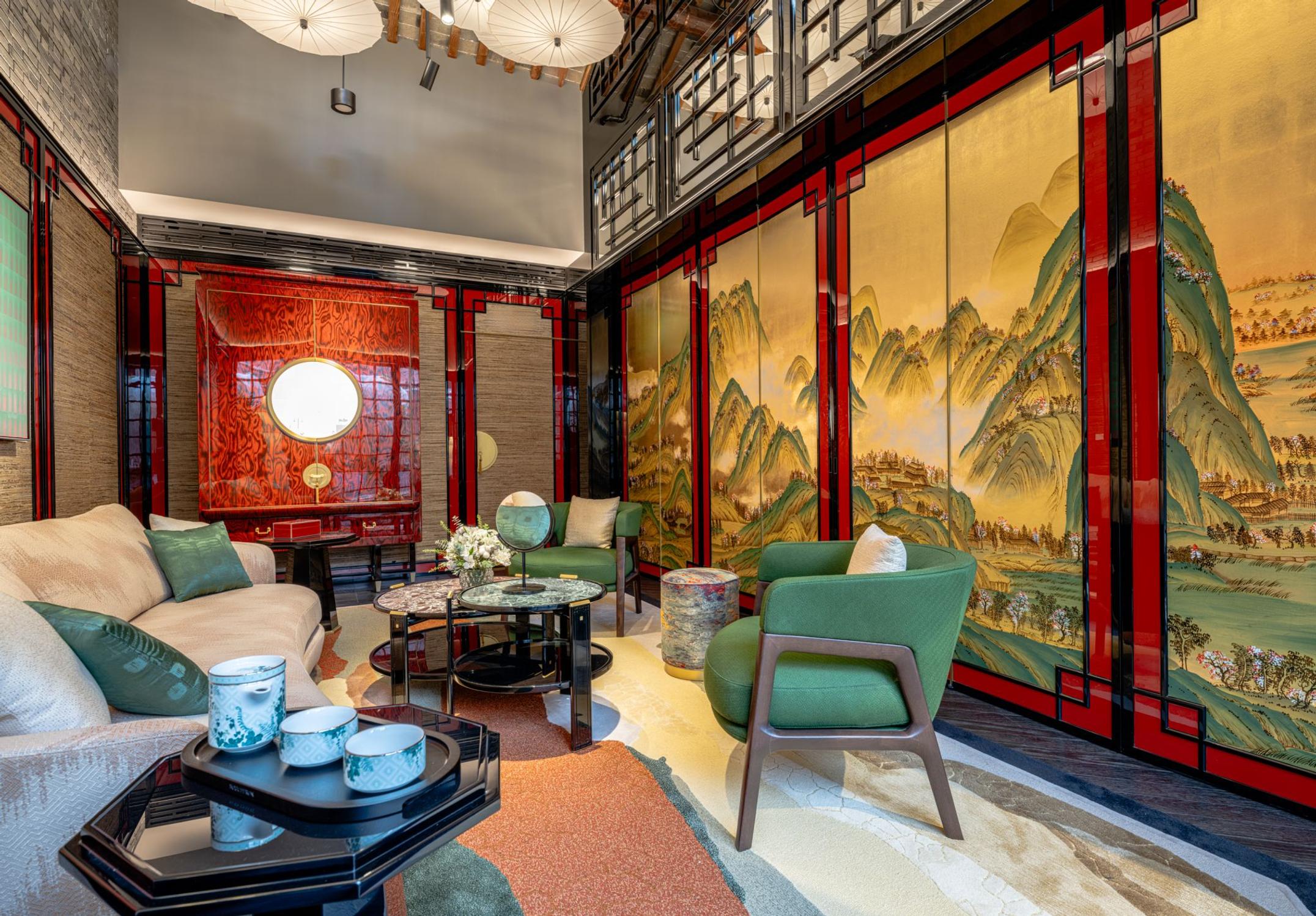 Deux cours intérieures, finitions d’artisanat (marqueterie de paille, plafonds peints) et un paravent contemporain inspiré de "Mille lis de rivières et de montagnes" tissent l’art local dans les codes du luxe. La nature et la lumière unifient l’ensemble en galerie vivante.
