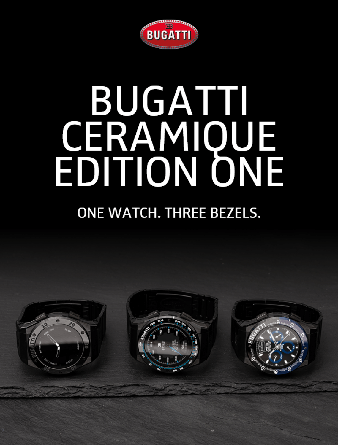 Bugatti Ceramique Edition One Pur Sport, Bugatti Ceramique Edition One La Noire et Bugatti Ceramique Edition One Divo : pour sa série inaugurale de smartwatches, la firme de Molsheim s'est inspirée des noms de ses véhicules les plus emblématiques.