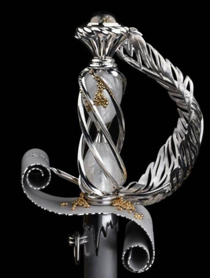 La poignée de l’épée a été sculptée dans deux ampoules de quartz rutilé. Elle représente un sablier brisé duquel s’échappent des billes d’or jaune Fairmined. Le « F » inscrit sur la poignée rappelle la nationalité franco-russe de l’écrivain.