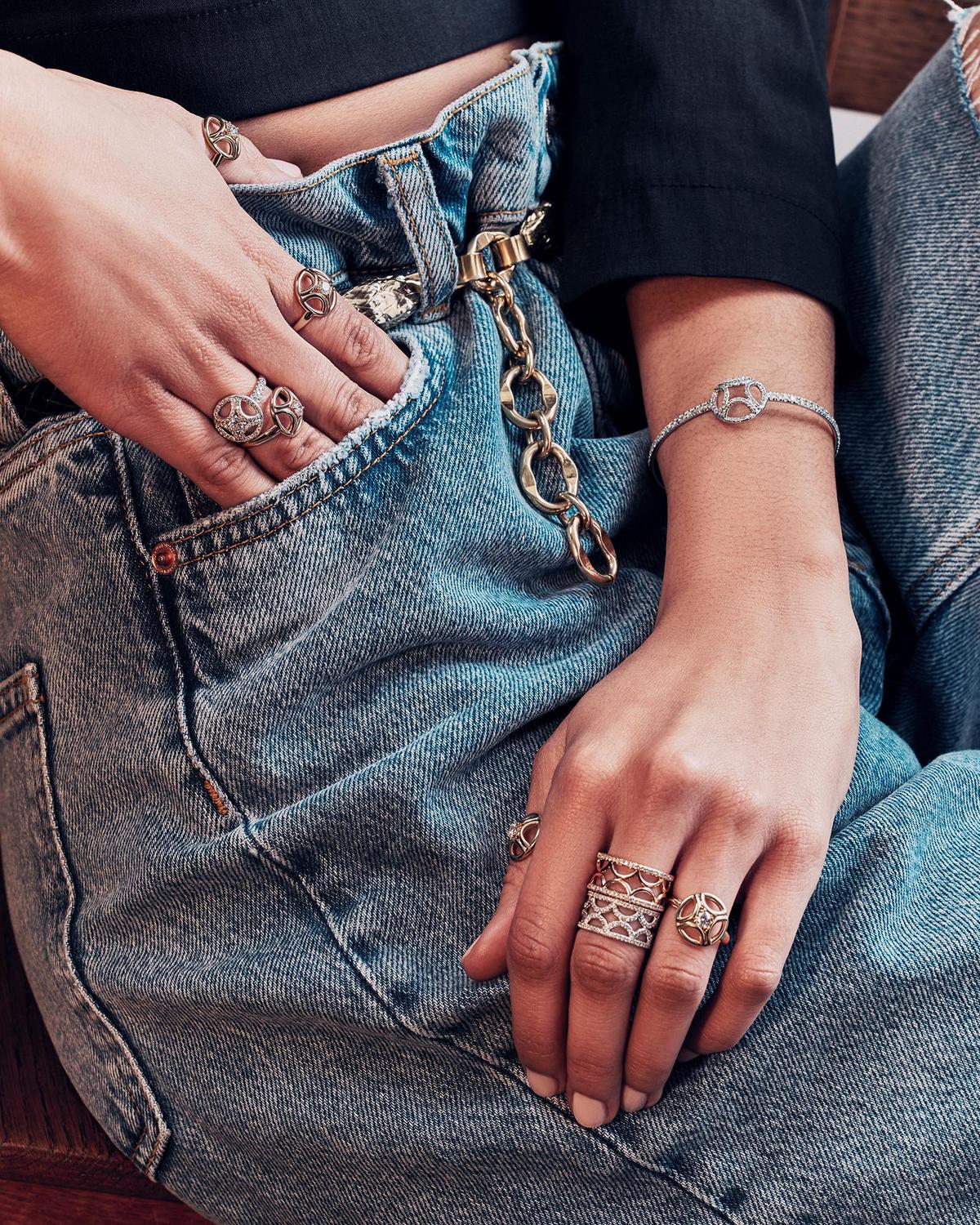 Pour chacune des collections, je suis toujours inspirée par un sujet lié au social, au genre, à ce que j’entends et ce que je vois. J’imagine comment les personnes pourraient porter les bijoux et comment ces derniers les représenteraient. Nos engagements doivent se refléter à chacune de nos collections, séparées en deux catégories : la joaillerie d’amour et la joaillerie fine. Pour Intrépide, j’ai souhaité redonner du sens au solitaire. J’ai donc imaginé une femme intrépide, n’ayant peur de rien, prête à aller jusqu’au bout pour atteindre ses objectifs, et qui s’offre à soi-même un solitaire pour célébrer ses amours et ses réussites. Au final, cette femme incarne l’ensemble des femmes, car je pense que nous avons toutes en nous cette force qui nous drive au quotidien. Pour Perpétuel.le, la collection est libre et spontanée. Ce nom de ligne représente un cycle infini, presque éternel : un cercle en perpétuel mouvement où le diamant vient se loger dans quatre arcades. Ces dernières se retrouvent dans toutes les architectures et leur harmonie met en avant la richesse culturelle de notre monde. Perpétuel.le renvoie aussi à notre curiosité et à notre ouverture d’esprit qui ne doivent jamais cesser d’être développées. Amour Perpétuel est une extension de cette collection, qui, comme la ligne Les absolus, contient des bagues de fiançailles et d’union.