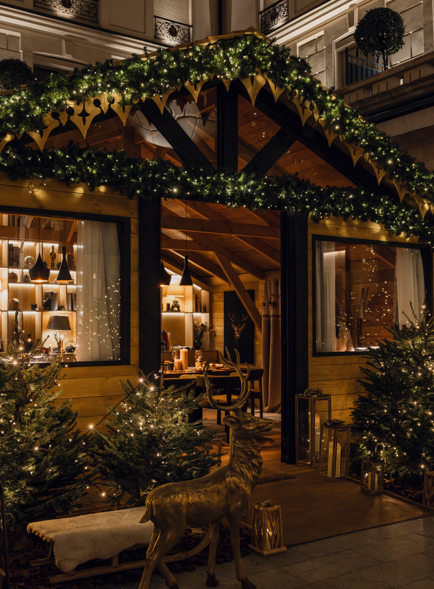 Dans le 2ème arrondissement parisien, le Park Hyatt Paris-Vendôme propose de privatiser, au déjeuner ou au dîner, son chalet de montagne niché dans sa cour intérieure. Une fois entrés dans cette maison de bois parsemée de lumières, les hôtes pourront s'immerger dans une atmosphère digne des établissements alpins et déguster la carte thématique pensée par Jean-François Rouquette. Le menu s'articule autour de deux entrées, entre saumon mariné et crème de lentille aux truffes, puis d'une raclette conviviale aux trois fromages accompagnés de charcuterie et de pommes grenailles, avant de terminer par un dessert léger aux clémentines.