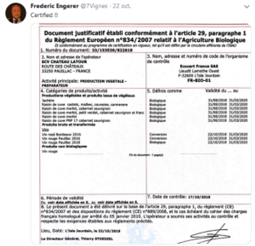 C’est sur Twitter que le directeur général du château a partagé la bonne nouvelle. « Certified!! » s’est-il réjoui en légende de la photo du certificat Ecocert de son domaine. Une façon d’annoncer l’entrée du Château Latour dans une nouvelle ère. Si la certification vient d’être annoncée, elle figure dans les papiers du château depuis quelques années, le temps de répondre à tous les critères du bio tout en préservant le goût originel du vin… Le temps, également, de communiquer sur cette évolution majeure pour le Grand cru.