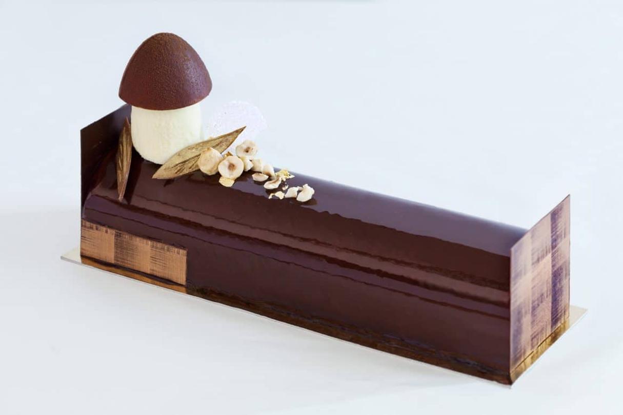 Yannick Begel crée la surprise en osant une alliance unique de chocolat et de cèpes. La bûche est enrobée d’un glaçage au cacao ainsi que d’un croustillant à la noisette.