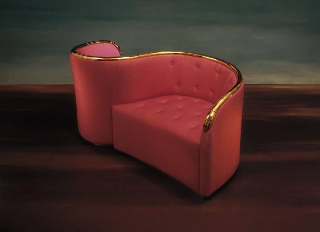 Le rose shocking de la Maison Schiaparelli se mêle aux mains surréalistes qui dessinent les contours de ce fauteuil utilisé à l’époque par les couples illégitimes.