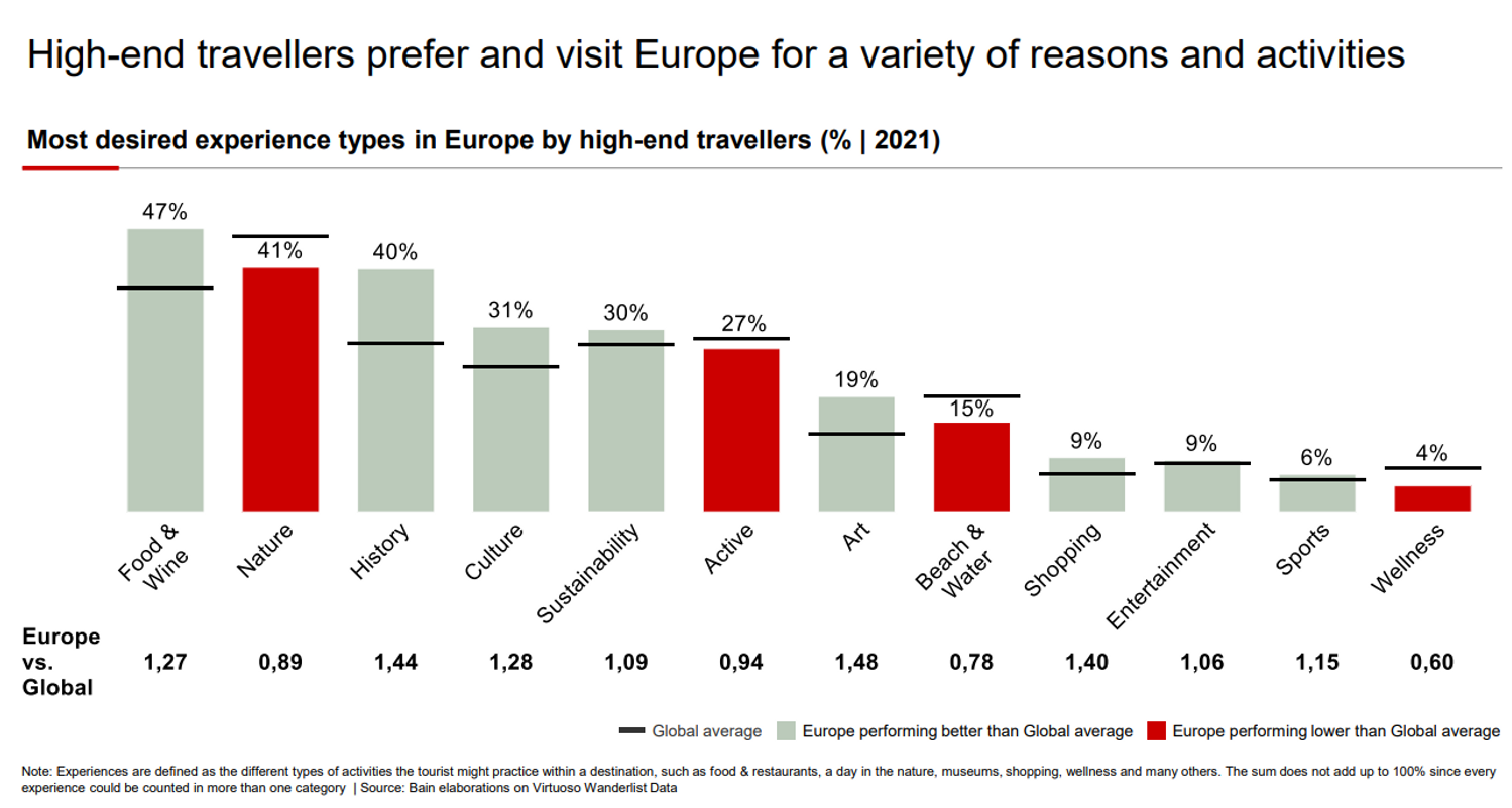 Selon les premières observations de l'étude - dont la version intégrale devrait être dévoilée courant juin -, le tourisme premium en Europe pèserait entre 130 et 170 milliards d'euros par an. Cinq pays génèrent 75% de cette valeur, à savoir le Royaume-Uni (pour 30 à 35 milliards d'euros), la France (22 à 27 milliards), l'Italie (20 à 25 milliards), l'Espagne (20 à 25 milliards, également) et l'Allemagne (5 à 10 milliards). Autant de destinations qui reflètent les attentes de la clientèle de prestige notamment en matière de musées, foires et galeries d'art, centres-villes animés, boutiques de luxe ou encore espaces historiques et architecturaux. Comme le montrent les tendances touristiques accélérées par la crise sanitaire, les sites naturels restent également prisés par les clients.