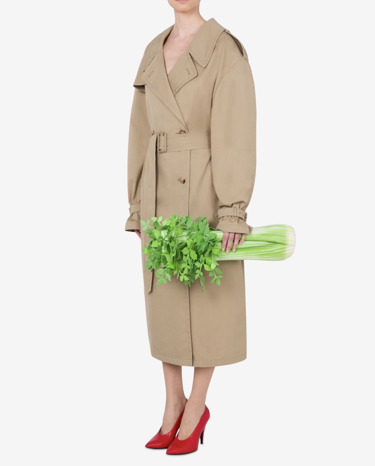 Officiellement, il porte le nom de "Sedano", céleri en italien. Présenté dans le cadre de la ligne "Items Bags" issue de la collection Automne-Hiver 2024 de Moschino, ce sac pochette se veut incarner le sens de la dérision cher à la marque et à son directeur artistique Adrian Appiolaza en imitant le légume dans sa version branche.