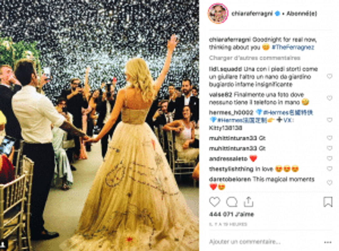 Car s’il y a bien une marque qui a tiré son épingle du jeu lors du mariage de l’influenceuse en Sicile – en septembre dernier, avec le chanteur Fedez – c’est bien l’illustre Maison de couture française. Aux commandes de la réalisation des deux robes de mariée, Dior a pu bénéficier de l’effet de rebond de ces noces démesurées qui ont même donné lieu à leur propre hashtag, #TheFerragnez. Ainsi, selon l’institut d’études Launchmetrics, sur un montant global estimé de 36 millions de dollars générés par l’événement en terme de Media Impact Value à travers les différentes plateformes de réseaux sociaux, 5,2 millions de dollars seraient directement liés à Dior… soit 15% du buzz total.