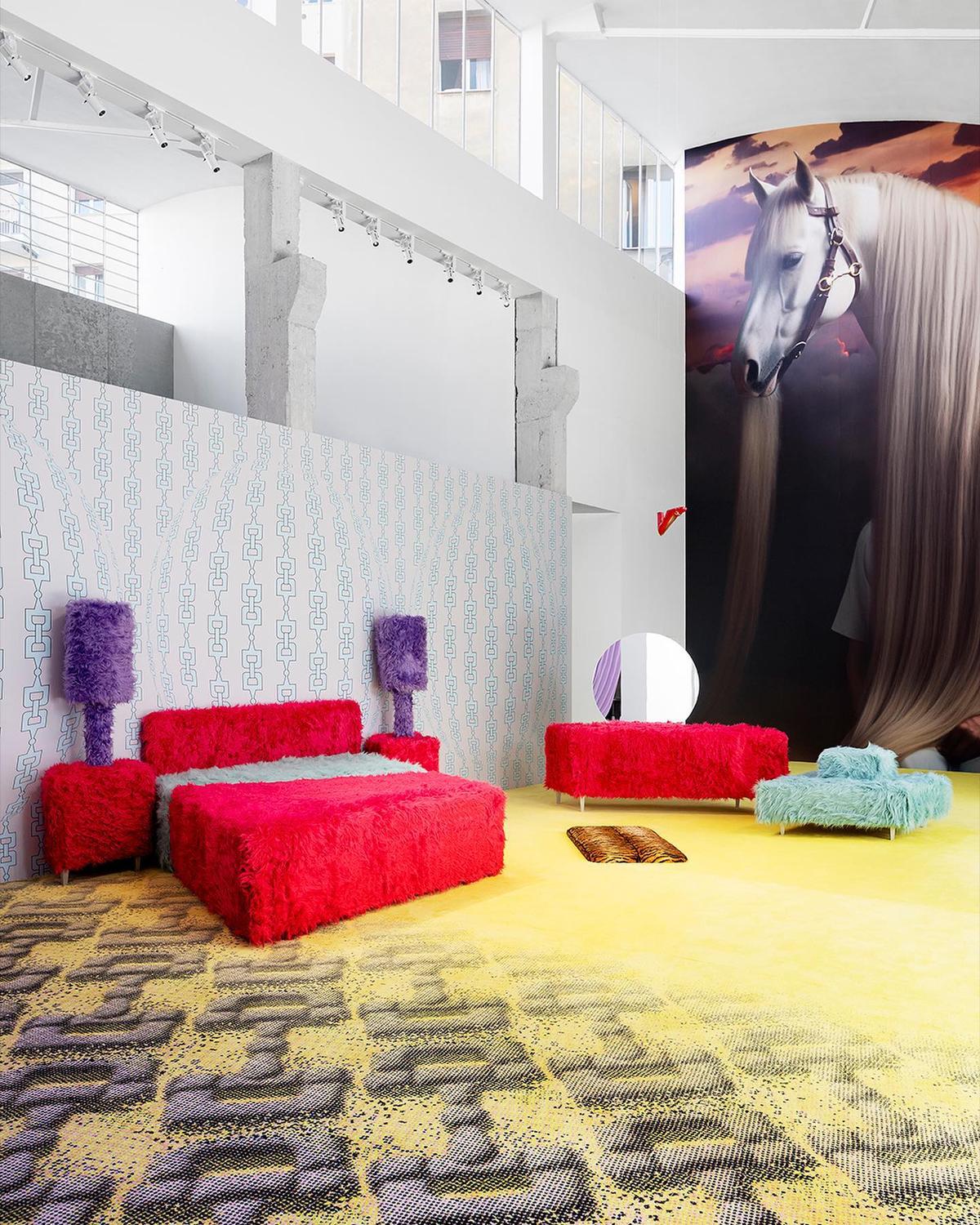 En effet, si l’on omet le déterminent rôle de Sylvie Fleury dans l’histoire de l’art contemporain, son Bedroom Ensemble II tout de fourrure colorée se montre extrêmement instagramable. Postée sur les réseaux, une artiste de la récupération récupérée par ceux qu’elle récupérait : Gucci sait aussi se montrer meta au delà de Roblox et Fortnite… Un placement niche délicat et une image de marque millimétrée pour une firme aux 10,5 milliards d’euros de chiffre d’affaire en 2022.