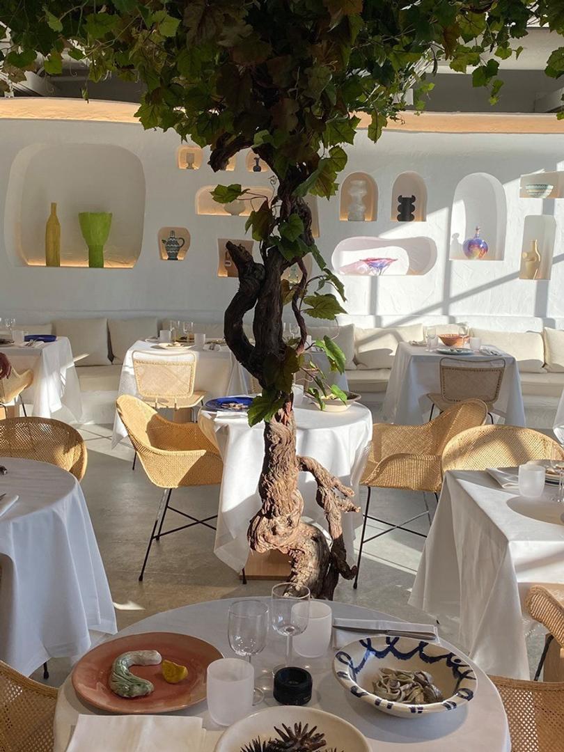 Bois clair, chaises en rotin et nappes immaculées, l’ambiance littorale tient autant aux notes végétales qu’à la minéralité d’un mur blanchi à la chaux dont les cavités abritent des poteries artisanales. Le tout bercé par une baie vitrée dominant l’une des avenues les plus prisées par les Maisons de Luxe. Une fois de plus, une ode à la Méditerranée si chère au styliste, originaire de Salon de Provence.