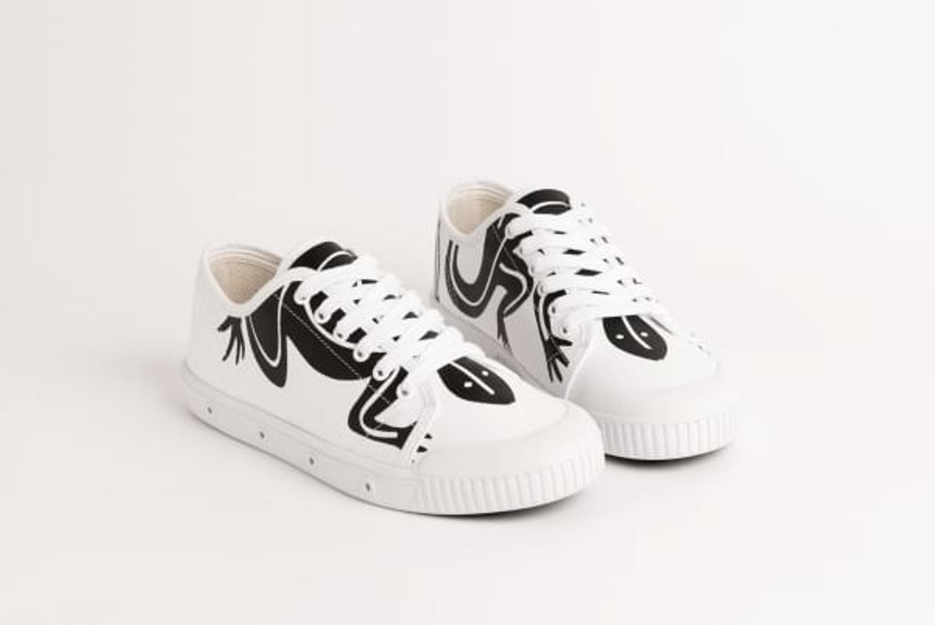 Déclinées en noir et blanc – ou blanc et noir selon les modèles – les tennis laissent apparaître le lézard sur le haut de la chaussure, se confondant avec les lacets pour la version adulte. Le modèle enfant est quant à lui doté de deux velcros.