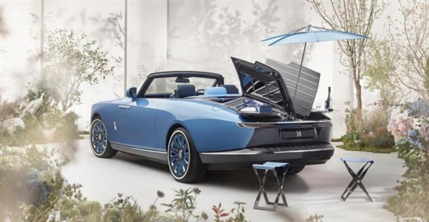 Tel est le prix à payer pour s'offrir l'un des trois exemplaires de la dernière-née de la marque britannique. Si son nom, Boat Tail, se traduit littéralement par "queue de bateau", le modèle est bien une déclinaison de la célèbre Phantom. Le cabriolet bleu de 5,8 mètres de long évoque néanmoins l'esthétique d'un yatch avec sa plage arrière en bois qui dissimule tout le matériel nécessaire à un pique nique ; en dépliant les volets de la structure, il est en effet possible de s'attabler et de profiter du mini-frigo à champagne - tempéré à six degrés -, d'un service complet de couverts ou encore d'un... parasol.