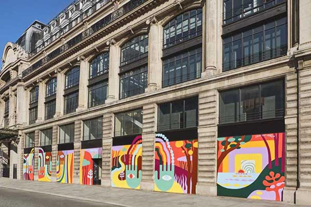“Neufs couleurs, neuf yeux et neufs cœurs”. Il aura fallu deux semaines de travail à l’artiste Luckylefthand (Steven Burke) pour apposer son empreinte sur les 280m2 de façades du rez-de-chaussée de l’adresse historique de la marque, à l’angle de la rue du Pont Neuf et du quai de la Mégisserie, en bordure de Seine.