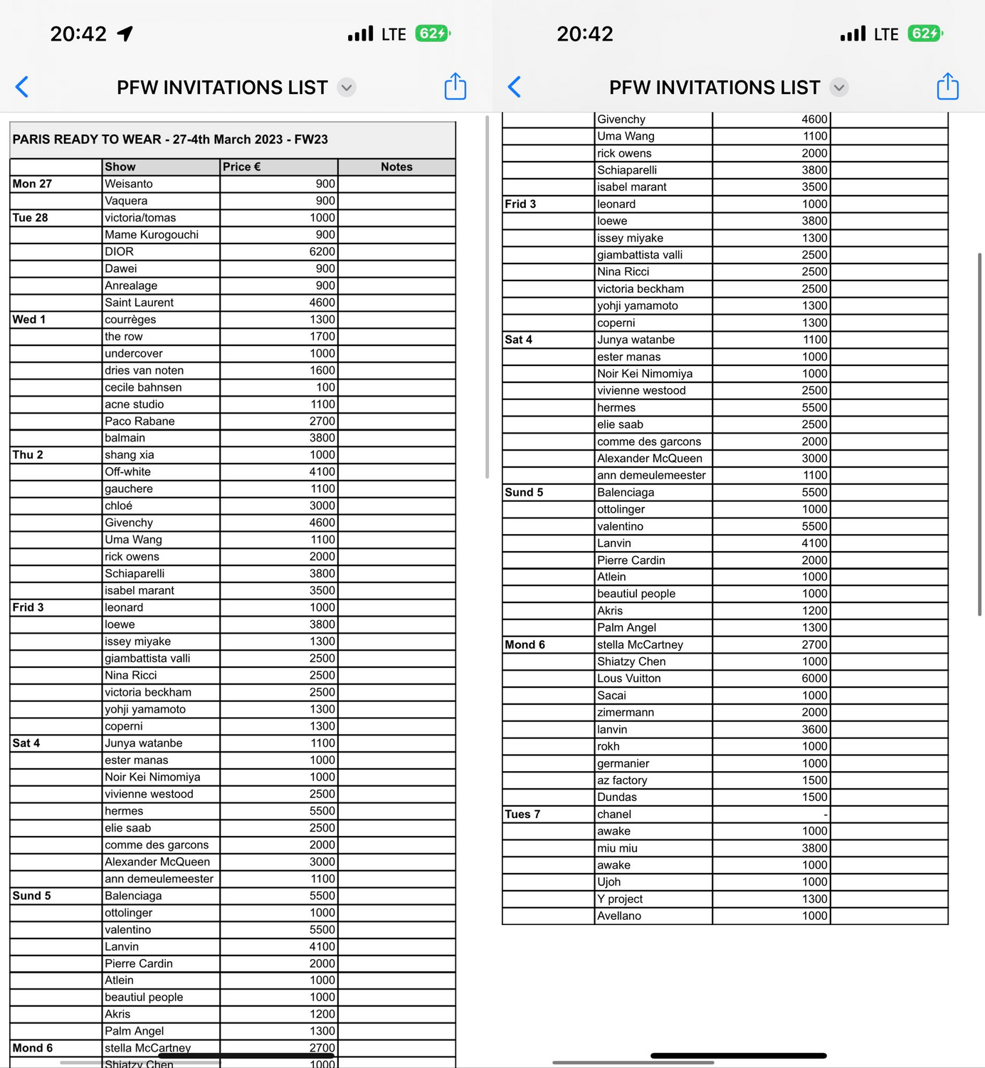 Quelques heures après, l'influenceur et rédacteur en chef du magazine Perfect Bryan Yambao - Bryanboy - a publié sur X un tableau excel d'une "très ancienne liste de prix d'invitations aux défilés de mode d'il y a quelques saisons". 6.200 euros pour Dior, 4.600 euros pour Saint Laurent et Givenchy, 4.100 euros pour Paco Rabanne, 5.500 euros pour Balenciaga, 6.000 euros pour Louis Vuitton... Autant de prix démesurés pour avoir la chance de se rendre à un show.