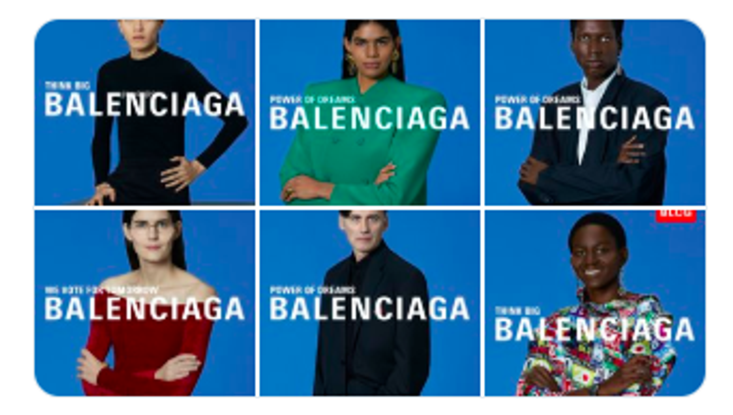 Alors que la Maison verra prochainement renaître son activité historique de Haute Couture sous l’impulsion de son directeur artistique Demna Gavasalia, elle se lance ici dans une initiative inclusive, déployée sur son compte Twitter. Sur la page officielle de la marque, on retrouve ainsi les portraits de chaque candidat(e), agrémentés de leur prénom : Eliza, Taro, Marius…. Lookés – forcément – en Balenciaga et immortalisés par la photographe Laurence Chaperon, chaque représentant est présenté sur un fond bleu vif agrémenté d’un logo BLCG. Outre l’apposition du nom « Balenciaga » en toutes lettres au centre de chaque affiche, les candidatures sont toutes complétées par des slogans récurrents. Êtes vous plutôt « Think Big », « Power of Dreams » ou « We Vote for Tomorrow » ?