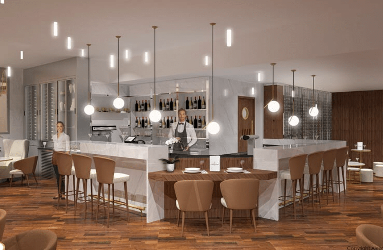 Le rez-de-chaussée est désormais un vaste open space, lieu de partage et de convivialité, avec son bar, sa réception et ses salons d’attente. La sélection des matériaux comme le marbre blanc, le bois et le cuir marron apportent une touche d’élégance contemporaine.