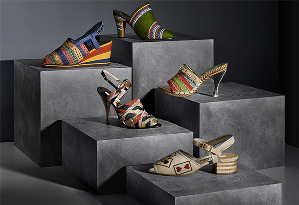 Une rétrospective des créations de la Maison italienne s’applique ainsi à présenter une sélection de documents de recherche et de pièces d’archives créées par le maître entre les années 20 et les années 50. Raphia, liège, plastique recyclé, cuir de poisson… autant de matériaux et de terrains d’exploration inspirés par la nature qui, sublimés par la main de l’homme, ont su donner naissance à des souliers furieusement précurseurs… À l’occasion de cette exposition, la marque ré-interprète d’ailleurs cinq modèles de paires dont les iconiques sandales compensées Rainbow, en crochet multicolore, initialement réalisées en 1938 pour Judy Garland. Re-baptisées Rainbow Future, elles se composent ici de fil de coton 100% recyclé et d’une semelle de bois, assemblés via une colle à base d’eau.